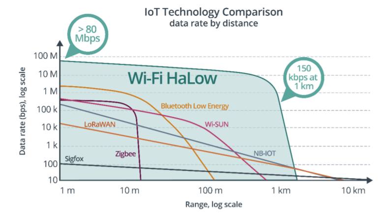 Figures 4 and 5 compare HaLow with other leading LPWANs. HaLow is offering the highest data rate among all the LPWAN technologies. The Wi-SUN FAN 2.0 has upgraded the data rate speed to 2 Mbps, missing from the chart published.