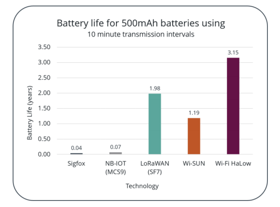 This is a difficult question to answer. According to the Wi-Fi Alliance, all LPWANs provide battery life in years. Most LPWANs state that battery life is from 10-15 years. Wi-SUN has stated battery life of up to 20 years. The results shown in Figure 6 were based on 10-minute transmission intervals using 500mAh batteries.